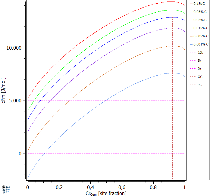 Example E6: Composition-dependent driving forces for carbide precipitation in Fe-C-Cr